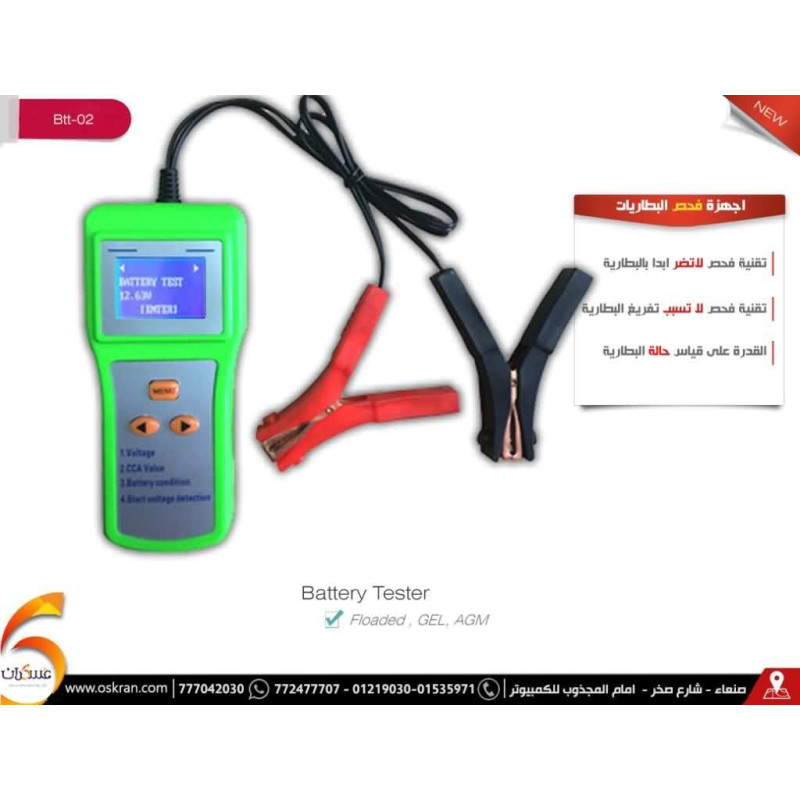 جهاز BTT-02 Battery Analyzer لفحص حالة البطاريات وتحليل أدائها، مناسب للاستخدام في أعمال الصيانة والمتابعة عند الحاجة لمعرفة حالة البطارية قبل الاستبدال أو إعادة الاستخدام. حسب الصورة، الجهاز مخصص لفحص أنواع بطاريات مثل AGM وAcid وGel، ويُستخدم للمساعدة في تقييم البطارية بدل الاعتماد على التخمين. مناسب لفنيي السيارات والطاقة والورش التي تتعامل مع البطاريات. يجب توصيل الجهاز بالطريقة الصحيحة واتباع تعليمات الفحص، كما يجب اعتبار نتيجة الفحص جزءًا من التشخيص وليس بديلًا عن فحص النظام كاملًا.