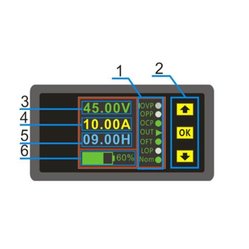 - عرض كلا من الفولتية والامبيرية بنفس الوقت وبالامكان التغيير الى سعة شحن البطارية والوقت.